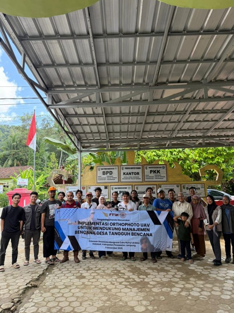 Pesawaran, Lampung — Program Studi Teknik Geomatika Institut Teknologi Sumatera (ITERA) melaksanakan kegiatan Pengabdian kepada Masyarakat (PKM) bertajuk “Implementasi Orthophoto UAV untuk Mendukung Manajemen Bencana Desa Tangguh Bencana Sidodadi” di Desa Sidodadi, Kabupaten Pesawaran, Lampung. Kegiatan ini dilaksanakan sejak Desember 2025 dan secara resmi diselesaikan dengan penyerahan hasil kepada pemerintah desa pada 4 Februari 2026.